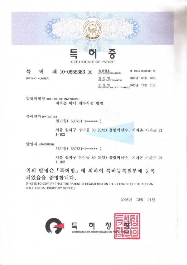 1.특허증(배수시공방법)-대표특허증
